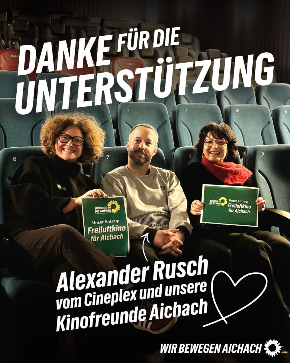 Der Kino-Vormittag bot zudem einen passenden Rahmen, um auf einen aktuellen Antrag der grünen Stadtratsfraktion aufmerksam zu machen: Für den Sommer 2026 soll ein Freiluftkino auf einer geeigneten städtischen Fläche in Aichach ermöglicht werden – durchgeführt vom Cineplex Aichach.
